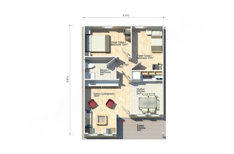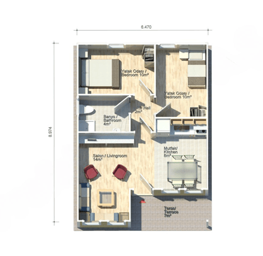 En plus de sa terrasse où vous pourrez déguster le goût de votre thé, la conception de la maison préfabriquée Calliste a une cuisine où vous pourrez facilement installer votre table à manger. La porte de votre maison de dimension 8.974 x 6.470 m s’ouvre sur un salon de 14 m2. Juste à côté du salon, se troue une cuisine de 8 m2 qui grâce à sa conception faite à manière à profiter au maximum de l’espace existant vous pourrez facilement placer un réfrigérateur, une cuisinière et un lave-vaisselle. L’espace qui peut être utilisé comme salle de séjour ou salon s’ouvre sur une entrée de 2 m2. Cette entrée s’ouvre sur deux chambres de 10 m2 chacune et une salle de bain de 4 m2 qui comprend un bac douche, un WC et un lavabo mais qui peut aussi prendre votre machine à laver.