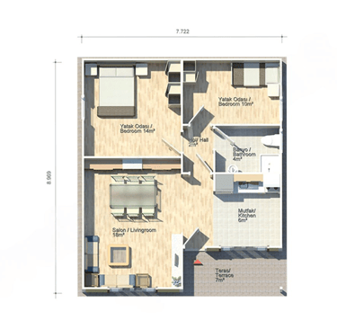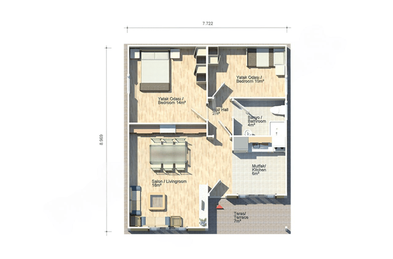 La maison préfabriquée Jacamar qui a deux chambres et un salon a une conception commode et pratique. Jacamar, peut être utilisée comme une maison d’été, un logement ou un bureau, a deux chambres à coucher de 14 mètres carrés et 10 mètres carrés. Pendant que le salon a une superficie de 18 mètres carrés, la cuisine fait 6 mètres carrés et la salle de bain 4 mètres carrés. Son architecture complétée avec une entrée de 2 mètres carrés, vous donne la paix grâce à sa terrasse de 7 mètres carrés. La chambre à coucher de ce modèle est suffisamment grande pour recevoir un lit à deux personnes et une armoire. Il est facilement possible d’accommoder un groupe de fauteuil et une salle à mander au salon.