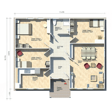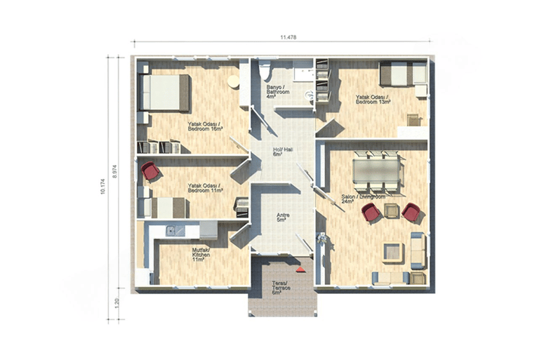 La maison préfabriquée Jacana est conçue avec une surface habitable de 106 m2. Les dimensions de cette structure, y compris la terrasse sont de 10.174 x 11.478 cm. Cette structure à un étage peut être utilisée comme maison individuelle, lieu de résidence ou de travail.