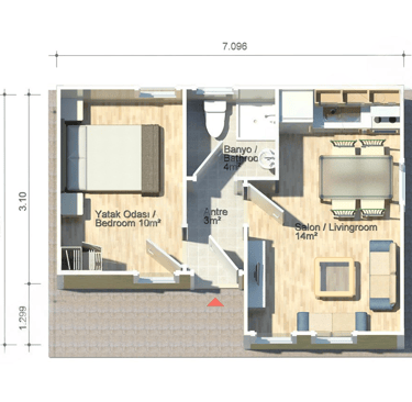 Tamatia, d’une apparence élégante de maison d’été, a aussi un petit espace qui peut être utilisé comme une petite terrasse. La porte d’entrée de cette maison s’ouvre sur une entrée de 3 m2 qui a trois portes qui s’ouvrent au salon, salle de bain et chambre à coucher. Dans le salon de 14 m2, se trouve aussi la cuisine où vous pourrez facilement placer votre cuisinière et réfrigérateur. Le salon qui peut facilement accommoder le groupe de fauteuil et une table à manger élabore un espace confortable pour ses propriétaires. Dans la salle de bain de 4 m2, se trouvent un bac à douche, un WC et un lavabo. La chambre à coucher de 10 m2 permet d’y placer un lit pour deux personnes et une grande armoire.